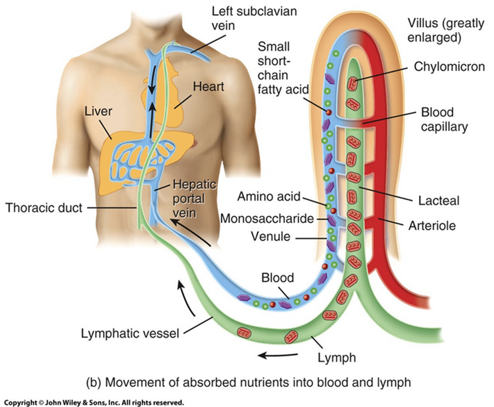 STEP 10: The chylomicrons travel from lacteals to lymphatic vessels, to the Thoracic Duct and then are dumped into blood where the left Subclavian and left Internal Jugular Veins merge.